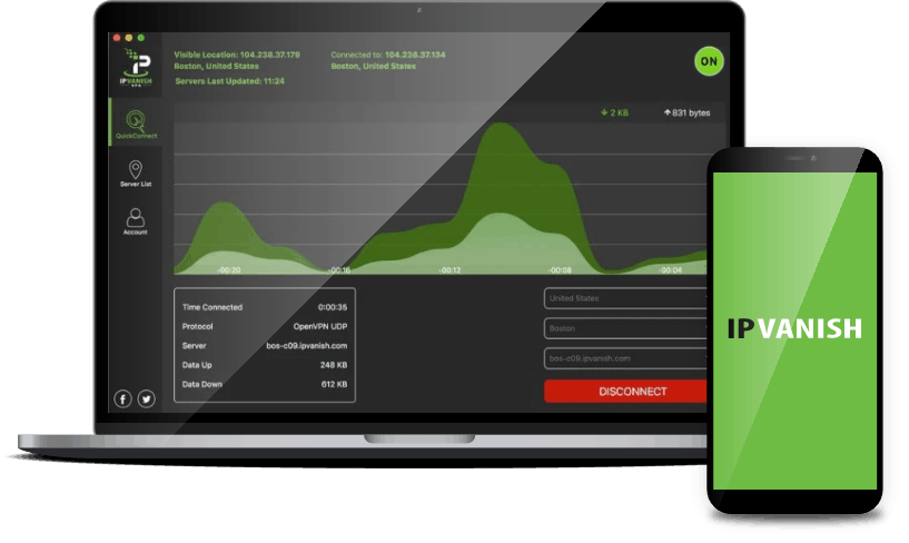 IPVanish, as a VPN, makes your IP address ‘vanish’ by hiding it behind the IP of one of its own servers. That’s great for your privacy. On top of that, IPVanish encrypts your browsing data so that no one else can see it besides you and the website or service you’re using.