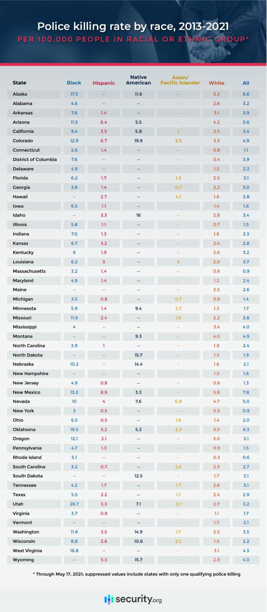 In Utah, for example, police have killed Black people at a rate of 26.7 per 100,000, compared with 2.7 per 100,000 for white people. West Virginia, Oklahoma, and Alaska all have disparities in the double digits.