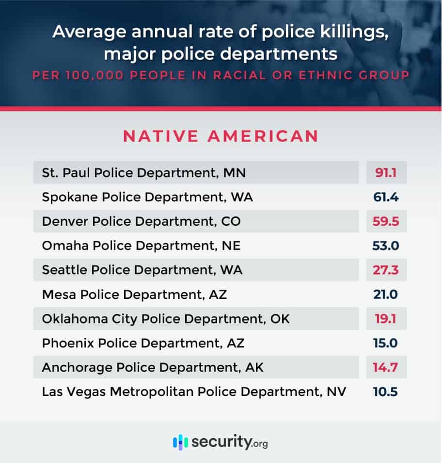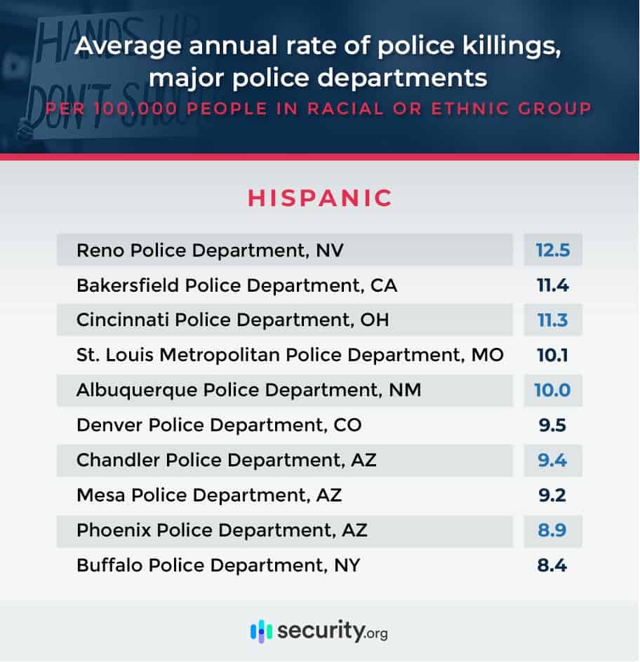 Phoenix police most consistently have high population-adjusted rates of killings of Black, Hispanic, and Native American people. In fact, the department appears in the top 10 for the rate at which police killed individuals in all three groups. Police in Albuquerque, Denver, Mesa, Oklahoma City, Reno, Spokane, and St. Louis all appear in the top 10 for these two racial groups.