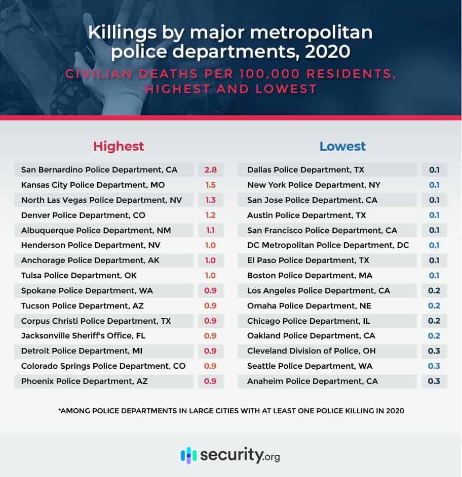 Accounting for population differences, the deadliest police department in the U.S. in 2020 was the San Bernardino Police Department. The population-adjusted rate of police killings by San Bernardino police was 2.8 per 100,000, almost double the rate of the next-highest department, Kansas City.