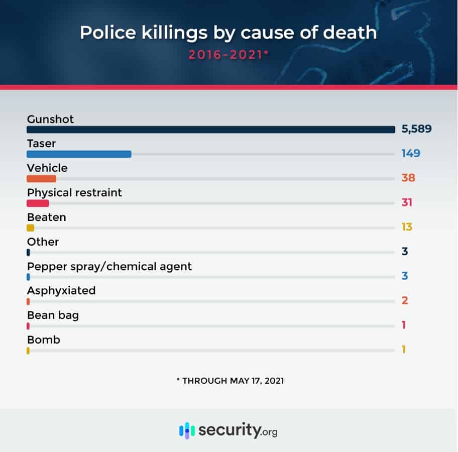 Over the past five years, shootings were the most common cause of these deaths, with gunshots accounting for more than 9 in 10 deaths. Tasers, vehicles, and physical restraint were the next three most common causes.