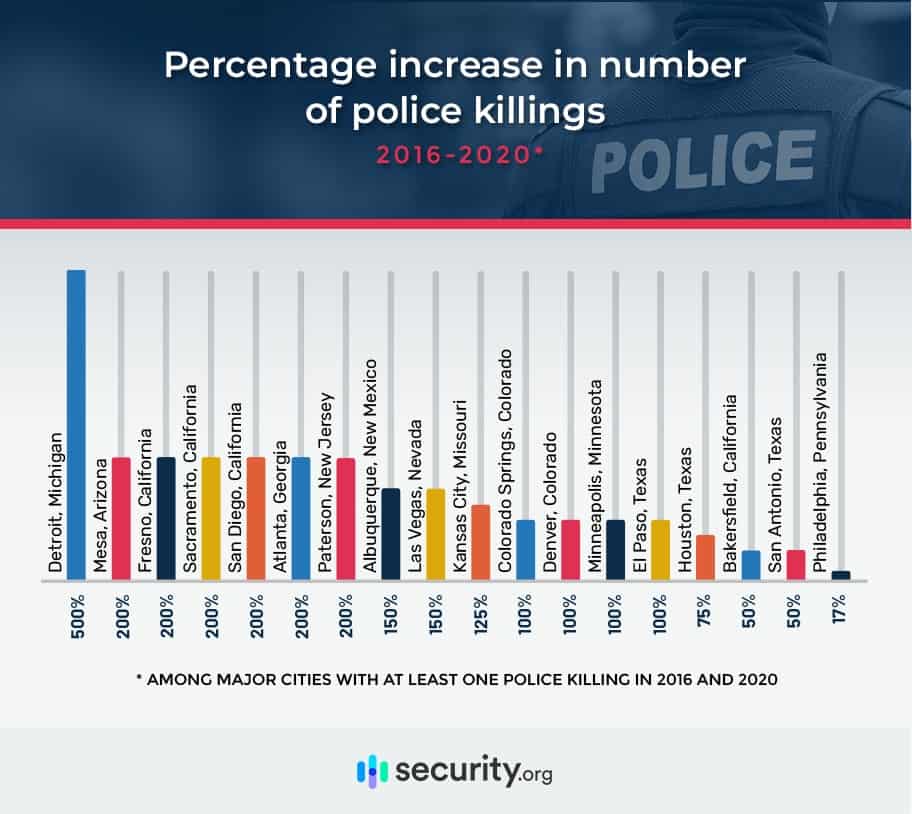 Other cities have seen police killings increase dramatically.4 Among cities with police killings in both 2016 and 2020, the number of fatal law enforcement incidents in Detroit surged by 500 percent.