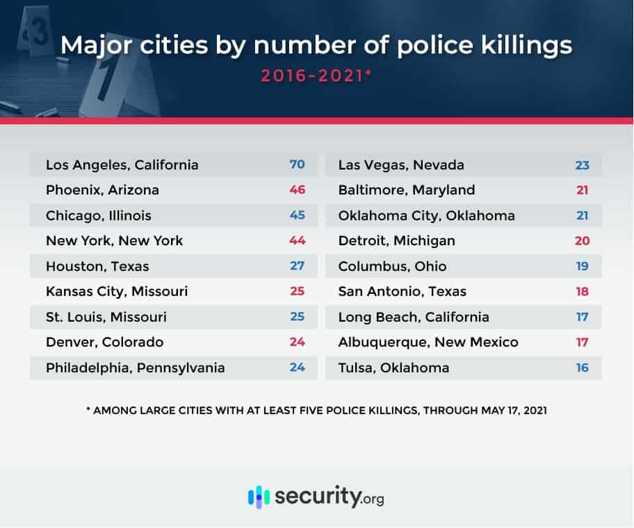 Zooming in on a city level, Los Angeles has seen the highest number of police killings over the past five years with 70. Phoenix comes second with 46, followed by Chicago with 45 people killed by police in the same time period.