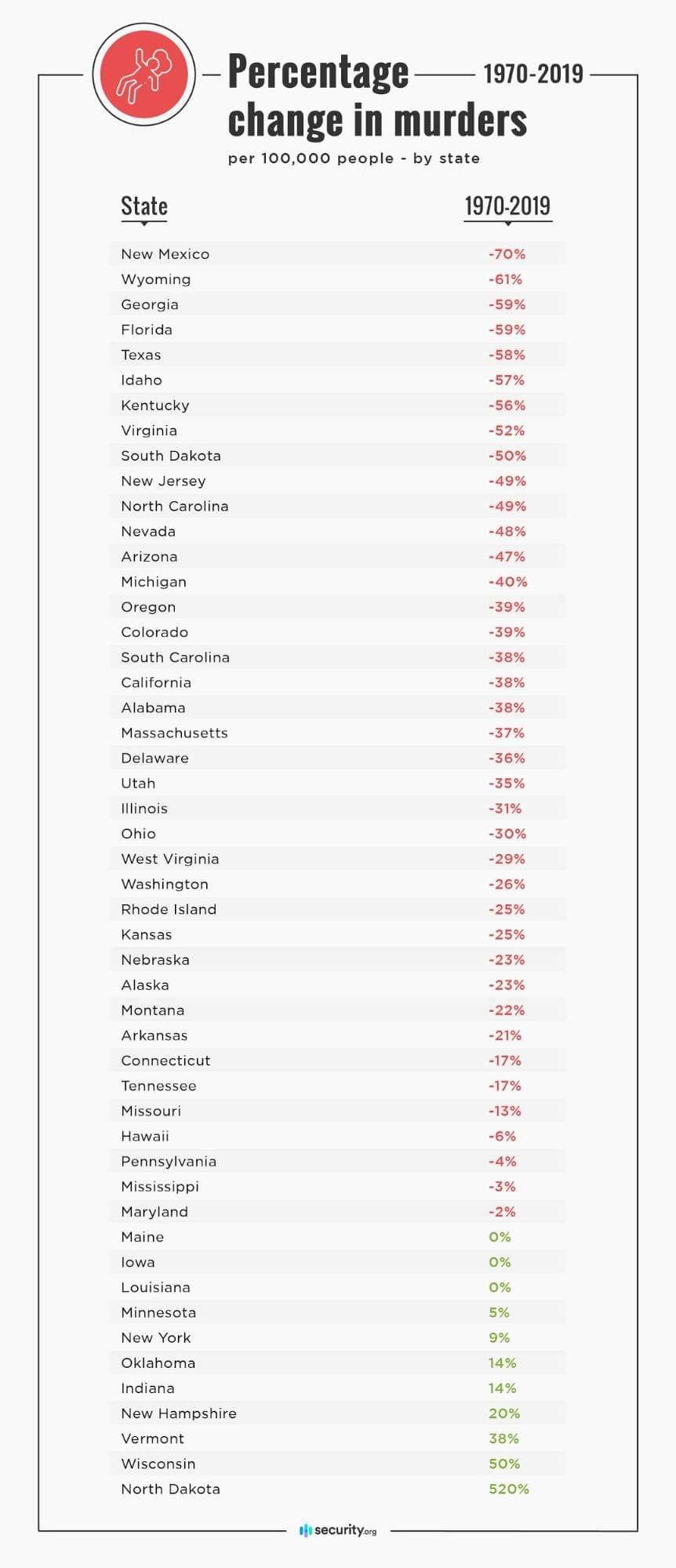 The past 10 years of data show that the majority of states have seen their murder rates rise, but what about historic data? We know that on a national level, the murder rate in 2019 was up from a record low of 4.4 per 100,000 people in 2014. However, the rate is less than half of the record high of 10.2 in 1980. And since 1970, only eight states have seen their murder rates rise.
