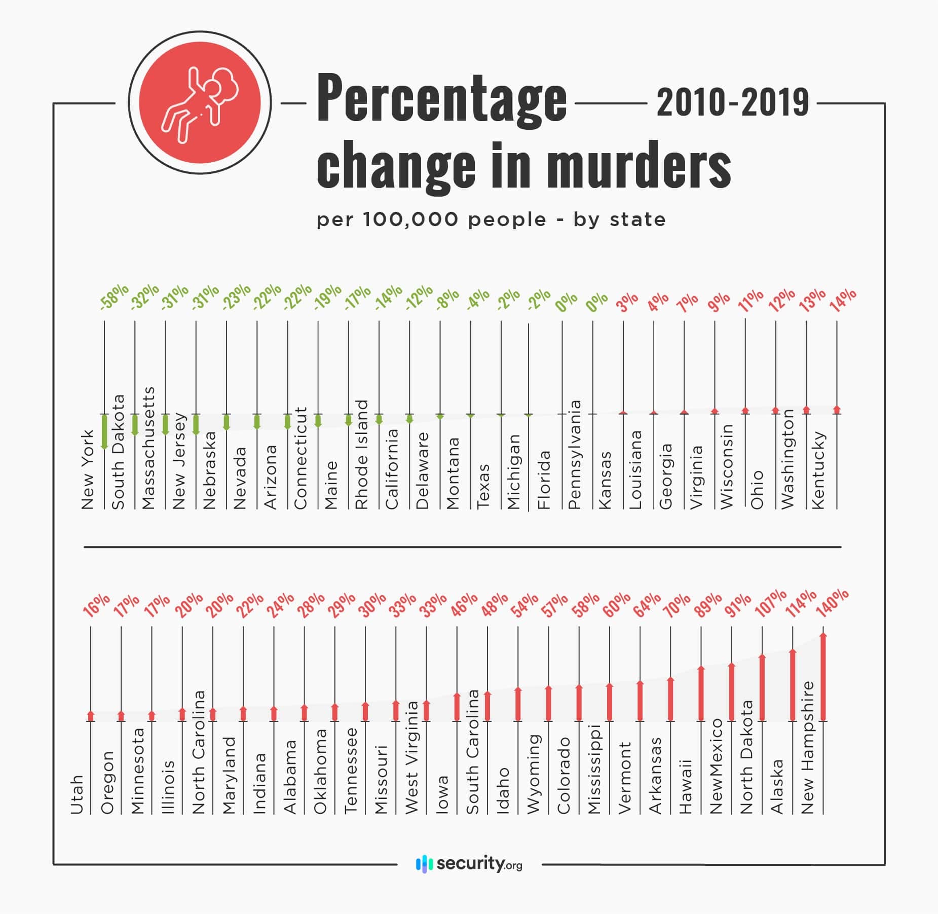 Only 15 states have seen their murder rates fall over the past 10 years, with an average decline of about 20 percent during that time. The majority of states have seen murder become more common over the past decade, while the homicide rate in three states (North Dakota, Alaska, and New Hampshire) has more than doubled.