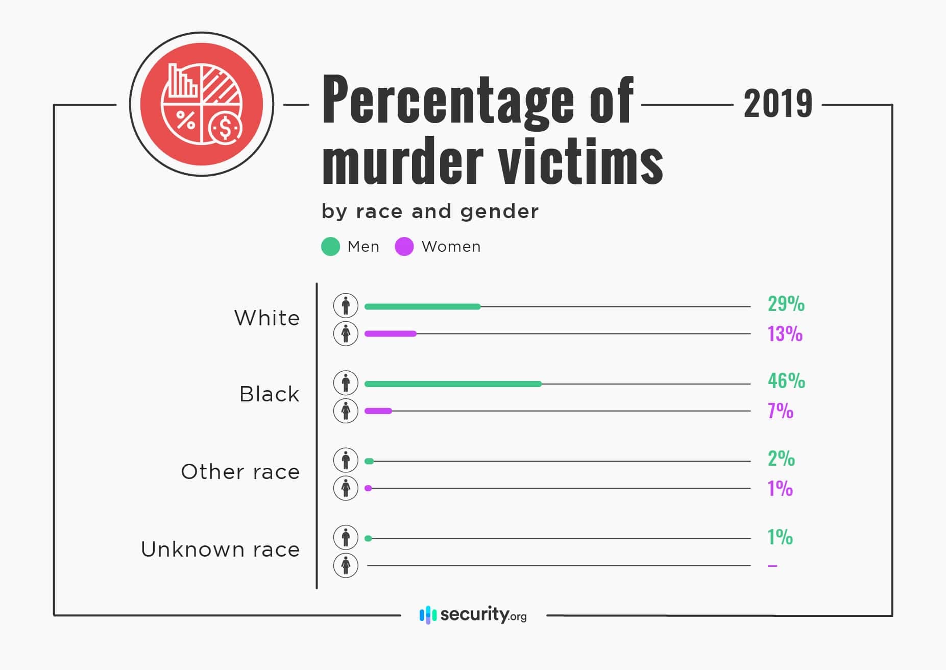 In 2019, men were far more likely to be victims of murder than women; 78 percent of murder victims whose gender was known were men, while 22 percent were women. Men account for just under half the U.S. population,4 making them 255 percent more likely to be murder victims than women.
