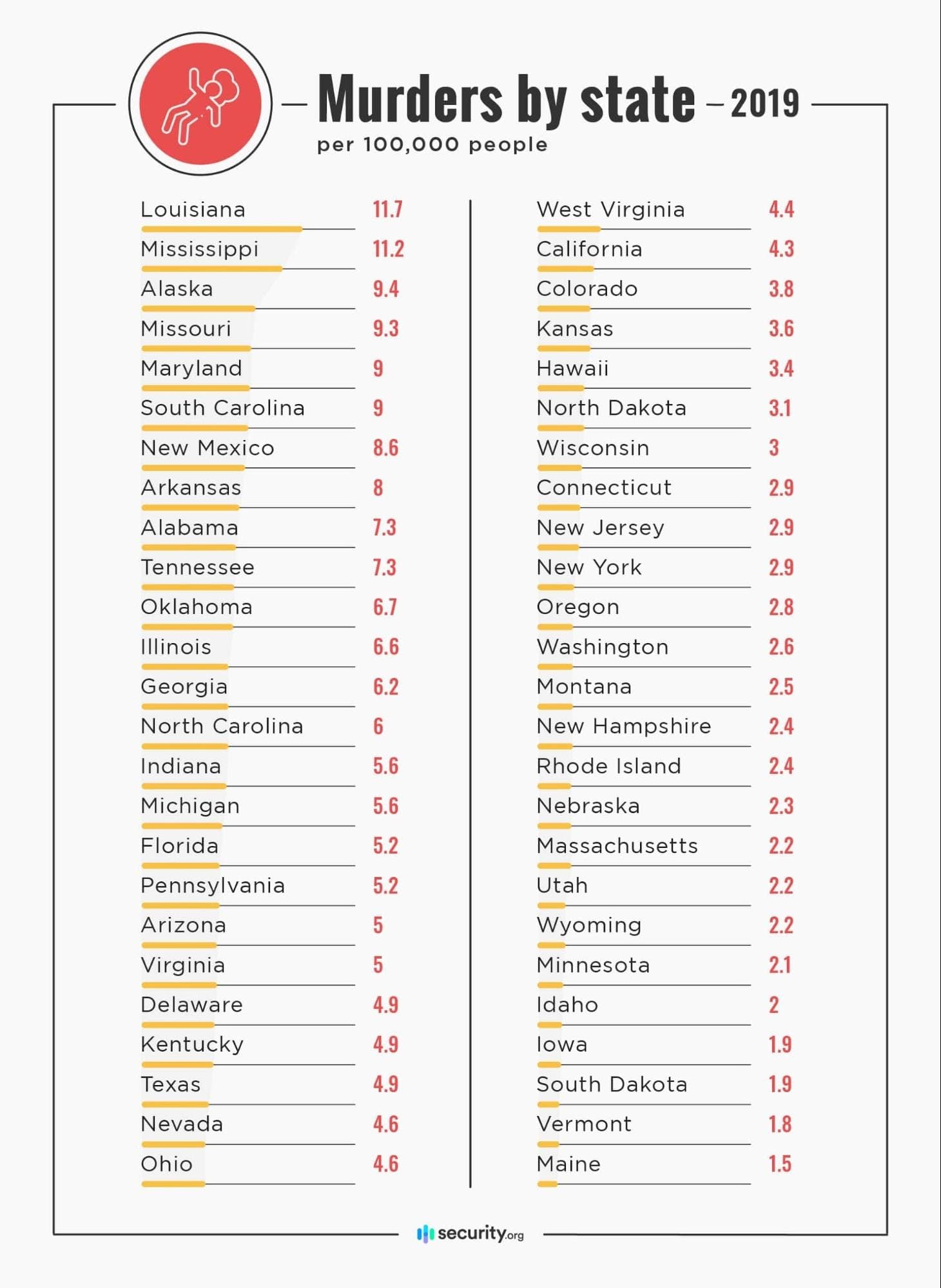 However, for all Americans, there’s about a 1-in-18,989 chance of being murdered. For comparison, an American has a 1-in-517 chance of dying from heart disease. Still, as we can clearly see, the likelihood of becoming a murder statistic depends to a major degree on where you live.13