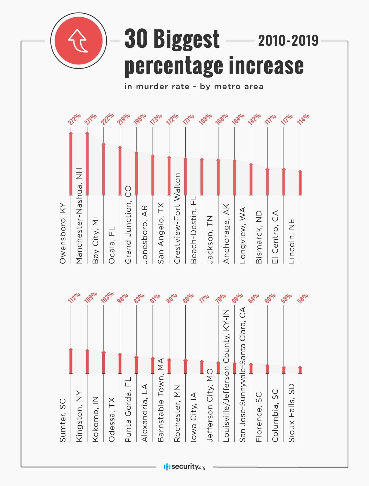 A majority of cities have seen murder rates climb over the past decade, and for many, rates have gone up quite dramatically. Among the more than 100 cities with statistically significant murder rates for 2019 (0.5 per 100,000 or higher) that also had published rates for 2010, the murder rate in the Owensboro, Kentucky, metro area climbed the highest, with an increase of more than 270 percent.