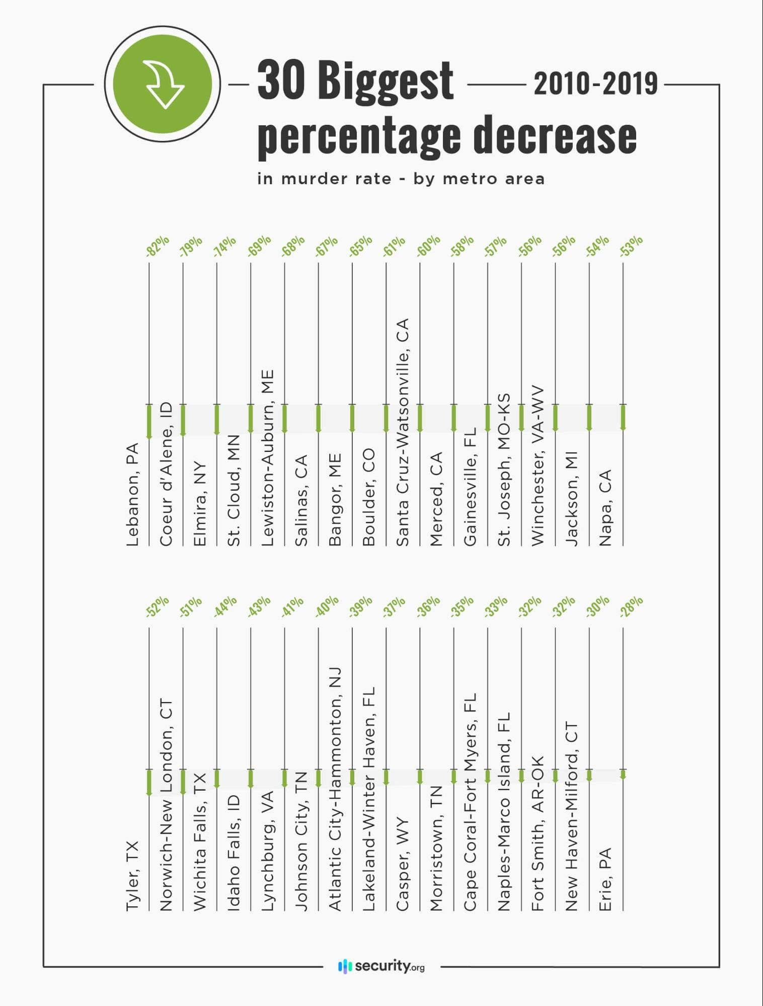 Some cities have made major strides in combating murder rates, and for the cities whose rates dropped, the average decline was more than 30 percent. Lebanon, Pennsylvania, saw the biggest decline in the murder rate at 82 percent, followed by Coeur d’Alene, Idaho, at 79 percent. Coeur d’Alene also has one of the five lowest murder rates among cities with available data.